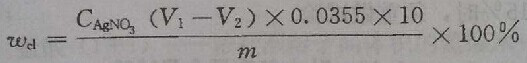 (1)稱取試樣500g,裝入帶塞磨口瓶中,用容量瓶取500ml蒸餾水,注入磨口瓶內,加上塞子,搖動一次,放置2h,然後每隔5min搖動一次,共搖動3次,使氯鹽充分溶解。將磨口瓶上部已澄清的溶液過濾,然後用移液管吸取50ml濾液,注入三角瓶中,再加入濃度為5%鉻酸鉀指示劑1ml,用0.01mol/L硝酸銀標準溶液滴定至呈現磚紅色為終點,記錄消耗的硝酸銀標準溶液的毫升數(V1)。